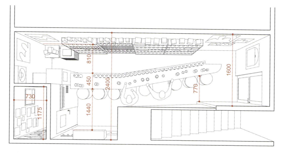 Bar Alpaca. Axonométrica. 8 asientos en 8 metros cuadrados.